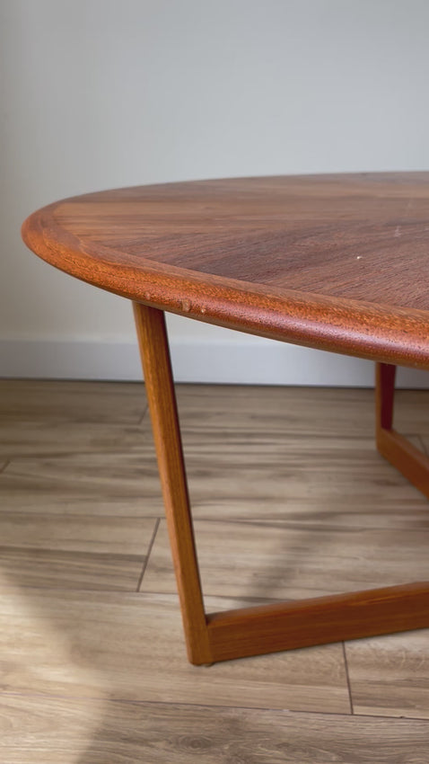 Excellent vintage condition. Tabletop has been refinished and treated with teak oil sealant. Teak wood is durable and wears well. Has been refinished in original style without a polyurethane coating. For maintenance, apply teak oil to maintain lustre throughout lifetime. Three small dips in table edge as shown in video that could not be sanded out without compromising table shape.