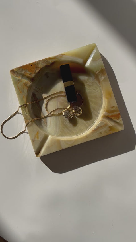 Oversized onyx ashtray. Perfect for use as an ashtray, décor piece, or trinket dish. Piece is green, cream, and brown tones with gorgeous swirl veining. Heavy, thick square piece of onyx.