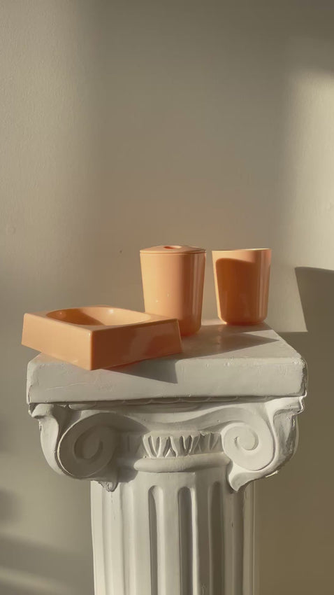 Adorable peach vintage toiletries bathroom set in peach plastic. Set of 3 pieces. Soap dish, toothbrush holder, and small cup.