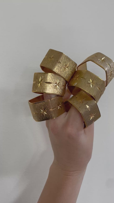 Set of 6 brass napkin rings in original packaging. Gorgeous textured and star pattern etching.
