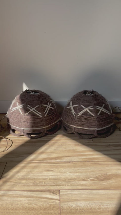 Vintage mid century woven wool pendant lamps with long cord and vintage metal chain cord cover. Woven wool is a taupey-brown with creamy white ‘X’ pattern. Both are plug-ins. ON/OFF switch is on interior light bulb socket. Light bulbs or hanging hooks not included. 2 lamps, each sold separately.